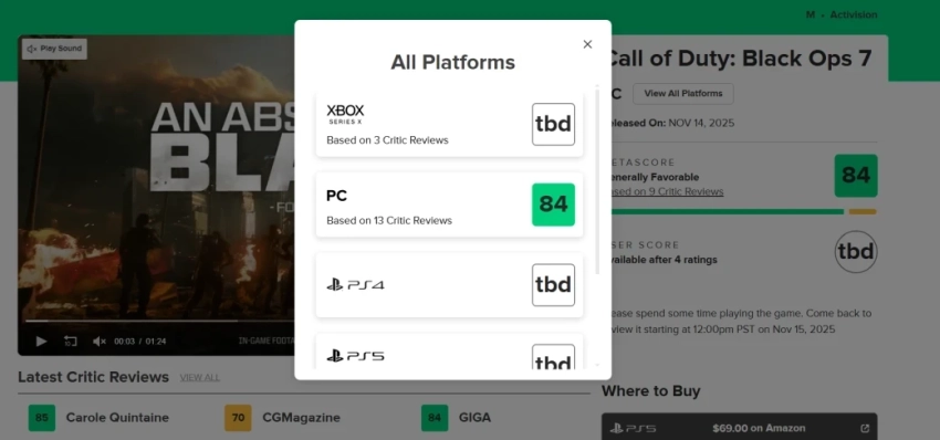 Обложка: скриншот игры Call of Duty: Black Ops 7С глобальным релизом Call of Duty: Black Ops 7 начали появляться и первые обзоры новинки СМИ. Рейтинг на агрегаторах ещё настаивается и на момент написания выглядит следующим образом: