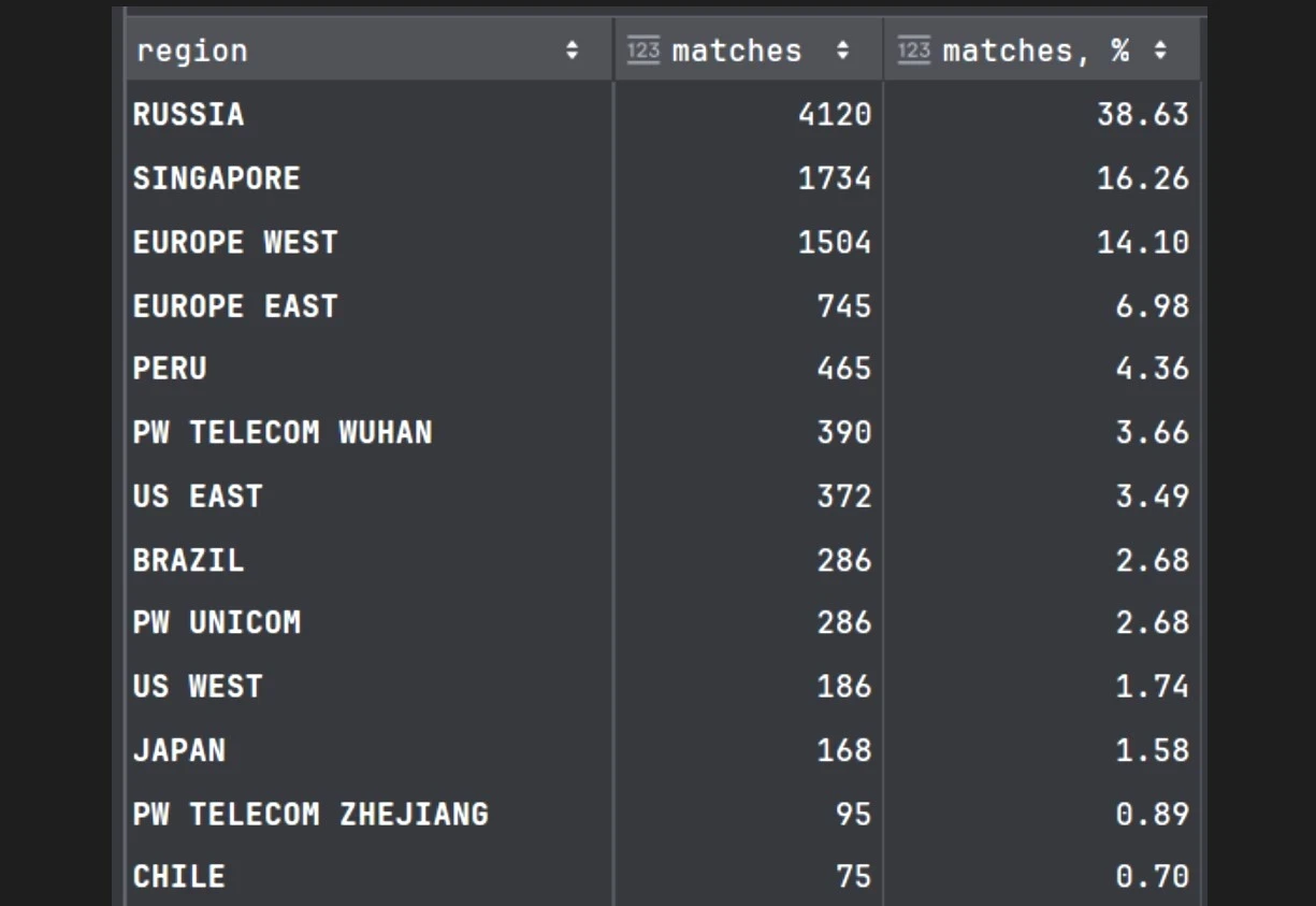 Автор исследования уточнил, что выборку можно было бы расширить, однако доступ к данным через API требует затрат, поэтому анализ носит предварительный характер. Тем не менее даже при таком объёме данных картина оказалась достаточно показательной: около 40% матчей пришлись именно на российский сервер.