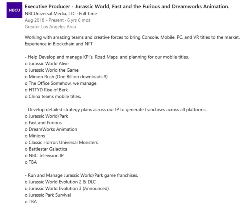 Самое интересное о кино на YouTube канале Игромании!Обложка: арт Jurassic World EvolutionВ профиле исполнительного продюсера игровых новинок Universal на Linkedln заметили упоминание некого нового проекта во вселенной «Парка юрского периода».