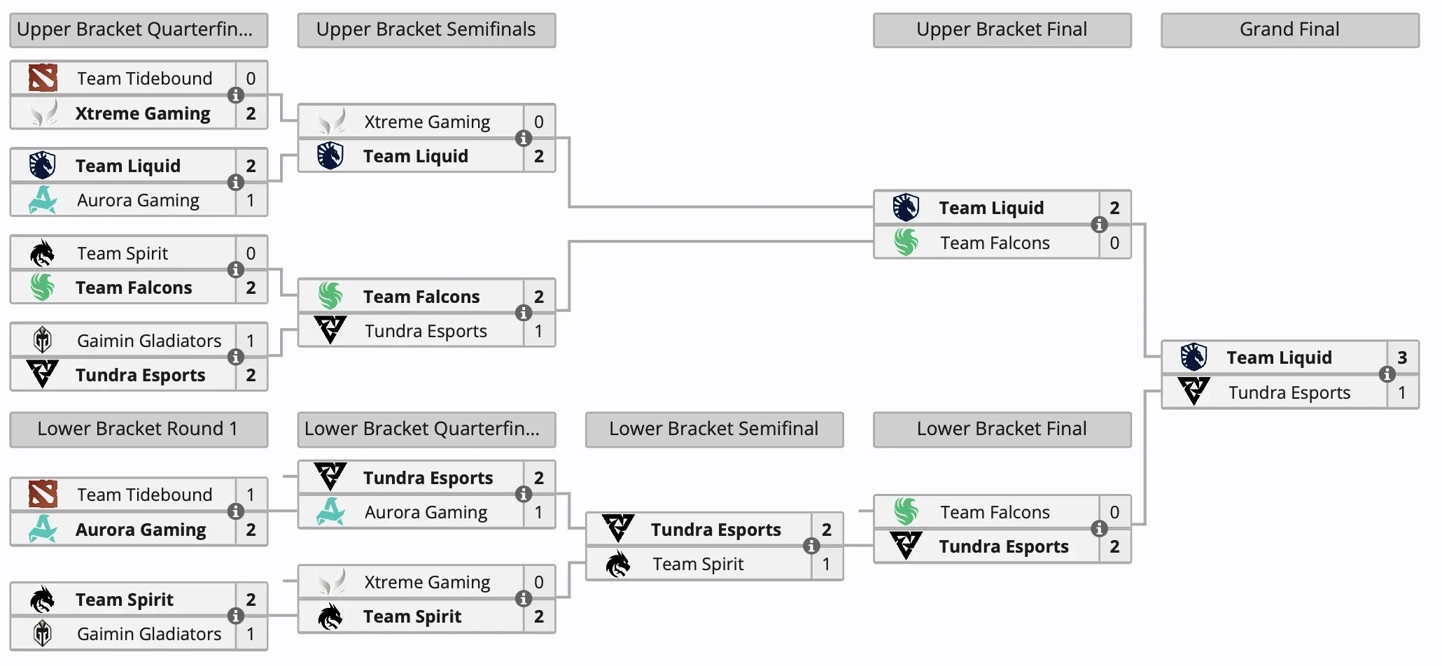 Team Falcons финишировала третьей, получив 120 тыс долларов. Российская команда Team Spirit заняла четвёртое место и заработала 80 тыс долларов, а Aurora Gaming поделила 5-6-е место с Xtreme Gaming и удостоилась 60 тыс долларов.
