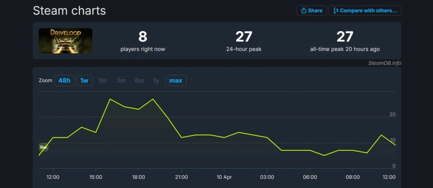Что касается пикового онлайна, то он соответствует нишевой игре. Рекорд Driveloop: Survivors — 27 одновременных игроков.