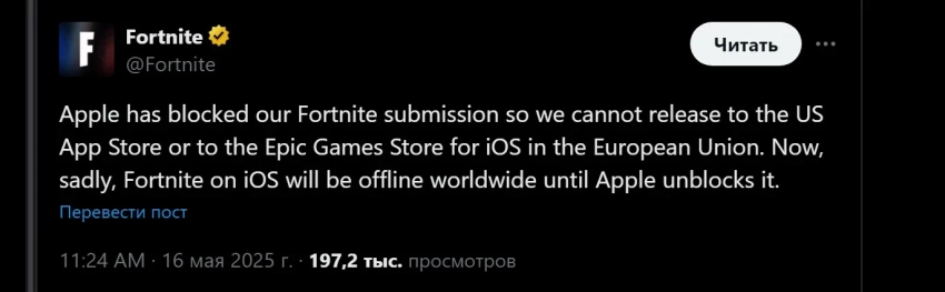 Предположить такую ситуацию можно было и ранее. 15 мая Тим Суини, глава Epic Games, пожаловался на Apple, которая в течение нескольких дней не одобряла публикацию Fortnite в App Store США. Чтобы не рушить планы и сохранять паритет версий, разработчикам пришлось повторно отправить заявку, но уже с очередным обновлением Fortnite.