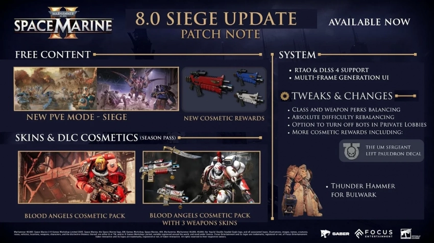 Кроме того, владельцы Season Pass могут получить доступ к новому контенту. Это чемпион «Белые шрамы» (White Scars), а также аналогичные наборы кастомизации брони и скинов для оружия. Вдобавок к этому был добавлен набор кастомизации «Кровавые ангелы» (Blood Angels).