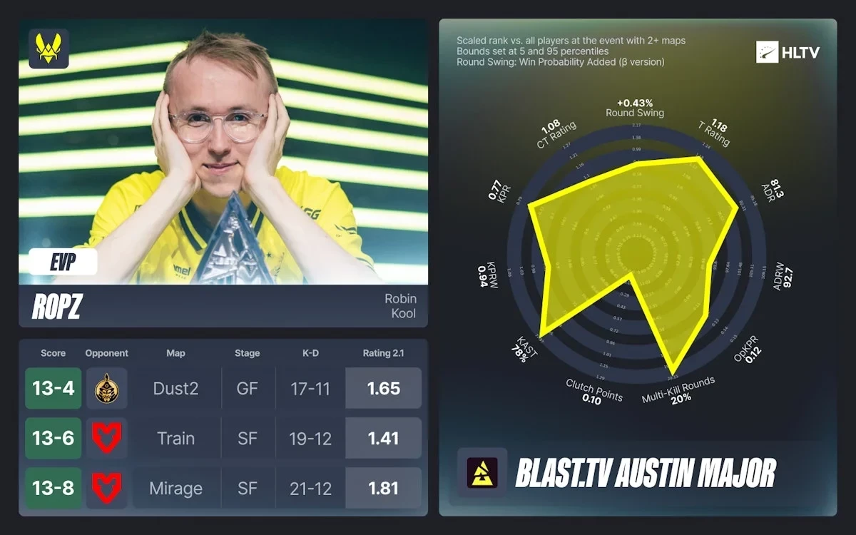 Робин «ropz» Кул из Эстонии получил признание за вклад в успех своей команды Vitality, став двукратным чемпионом мажора. Его игра в полуфинале против бывшего клуба MOUZ стала одной из самых запоминающихся на турнире.