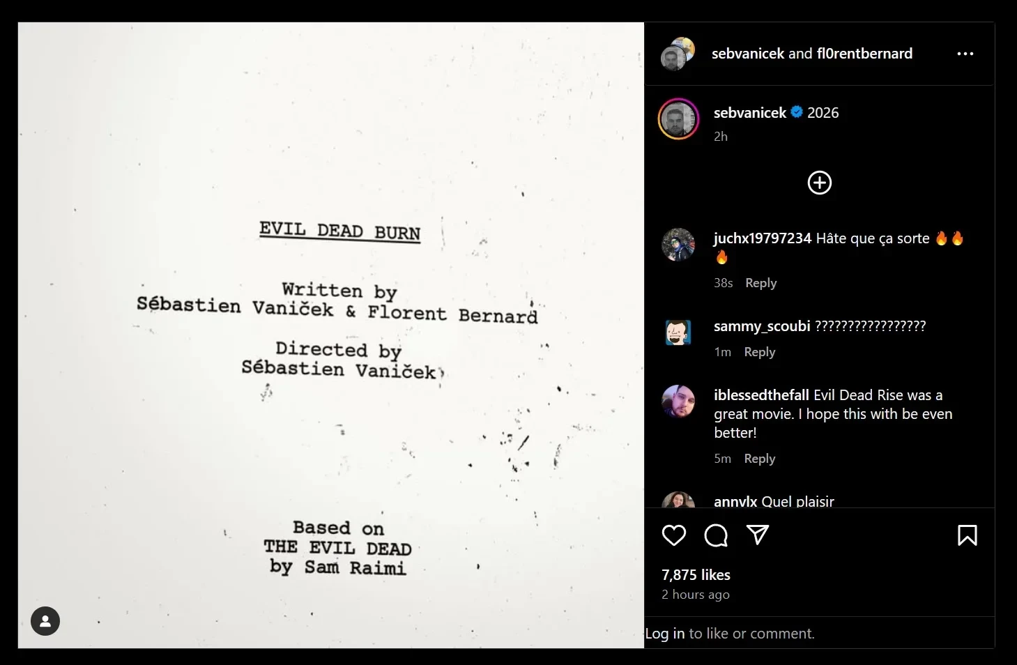 Сценарий нового фильма написан самим Ваничеком и Флораном Бернаром — до этого творческий дуэт работал над арахнофобных хоррором «Паутина страха» 2023 года. И, похоже, что с Evil Dead Burn Ваничек собирается пуститься во все тяжкие.