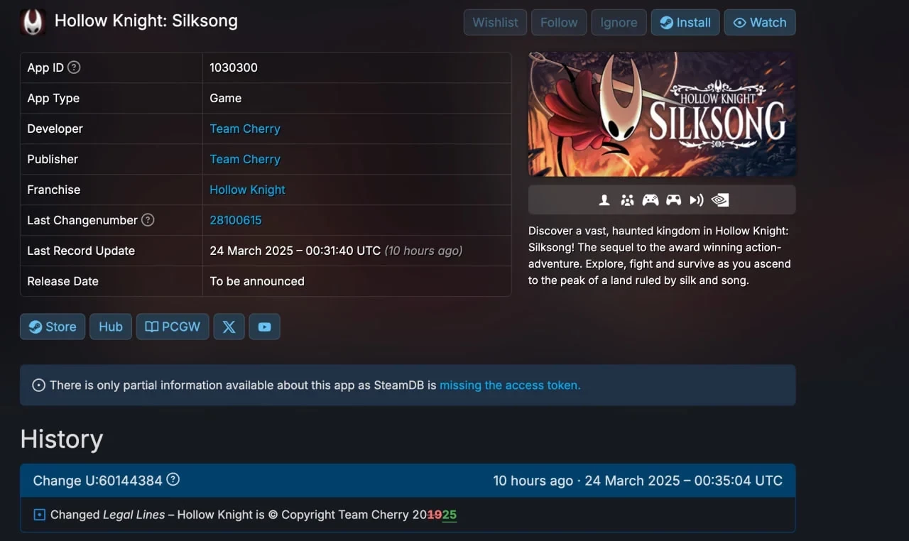 Оказывается, что у «Силксонга» сегодня, 24 марта, обновили данные в Steam. В частности, изменения коснулись авторского права Team Cherry на проект, где теперь указан не 2019-й, а 2025-й год. Кроме того, упоминается потенциальная поддержка Geforce Now для игры.