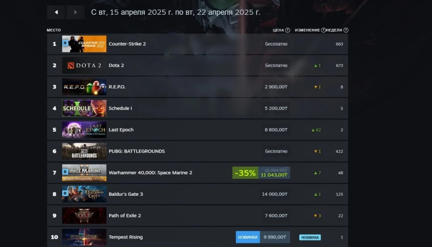 Если говорить о российском регионе, то там первую десятку закрывает Tempest Rising. Других новинок в топе нет, однако Last Epoch также добралась до пятого места. А Warhammer 40,000: Space Marine 2 на фоне скидки завоевала седьмую строчку, обогнав Baldur’s Gate III.